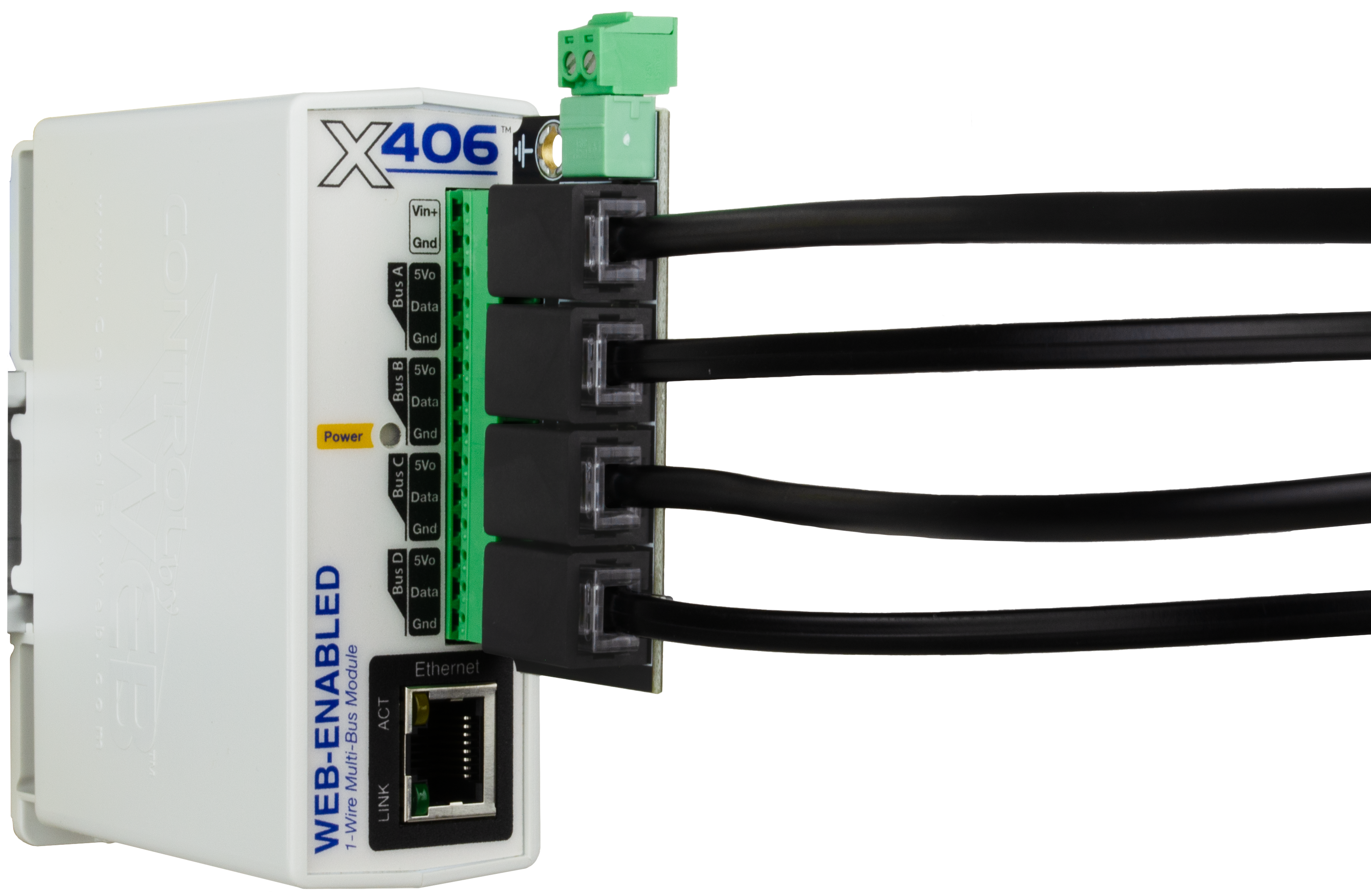 When a chain of X-QCS sensors are plugged into a ControlByWeb controller—such as the X-406™ 1-Wire Multi-Bus Module or any other module with a 1-Wire bus—each sensor’s position in a chain is recorded and the device ID is automatically configured. This is true for both new and existing setups, and even when replacing single temperature sensors midway through an existing chain.