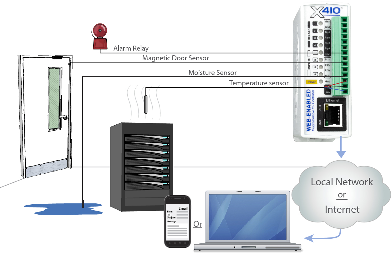Several ControlByWeb modules have digital (or discrete) inputs. Digital inputs are binary with on/off states where the presence of an input voltage is “on” and the absence of a voltage is “off”, making them ideal for monitoring door contacts, push buttons, alarm relays, and other binary devices.