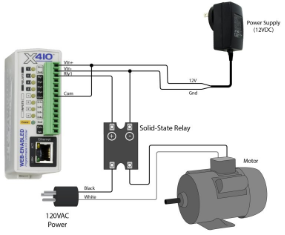 The illustration below shows how a 15-Amp motor can be controlled using an external relay. In the example, the X-410’s 1-Amp relay controls the external relay, and the external relay controls the 15-Amp load.