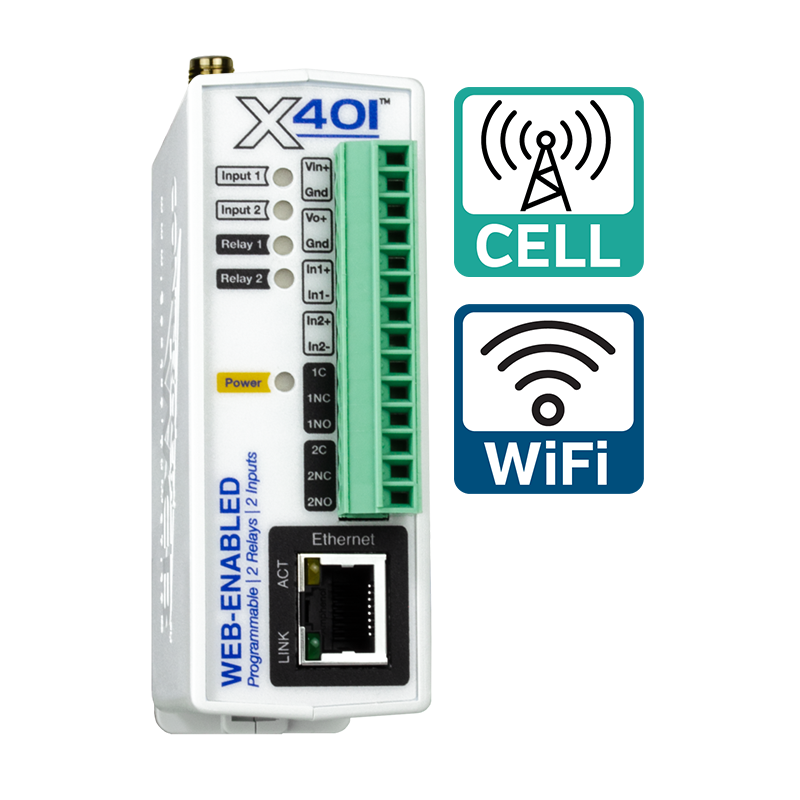 When a hardwired Ethernet connection isn’t practical, WiFi connectivity allows you to easily monitor and control your I/O module wirelessly. The built-in WiFi capability of the X-401W allows you to create logic, monitor inputs, and trigger relays through a standard web browser and WiFi network. (Note that an Ethernet connection is required for initial setup of 400 Series devices.)