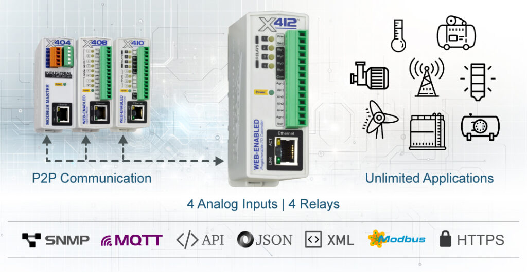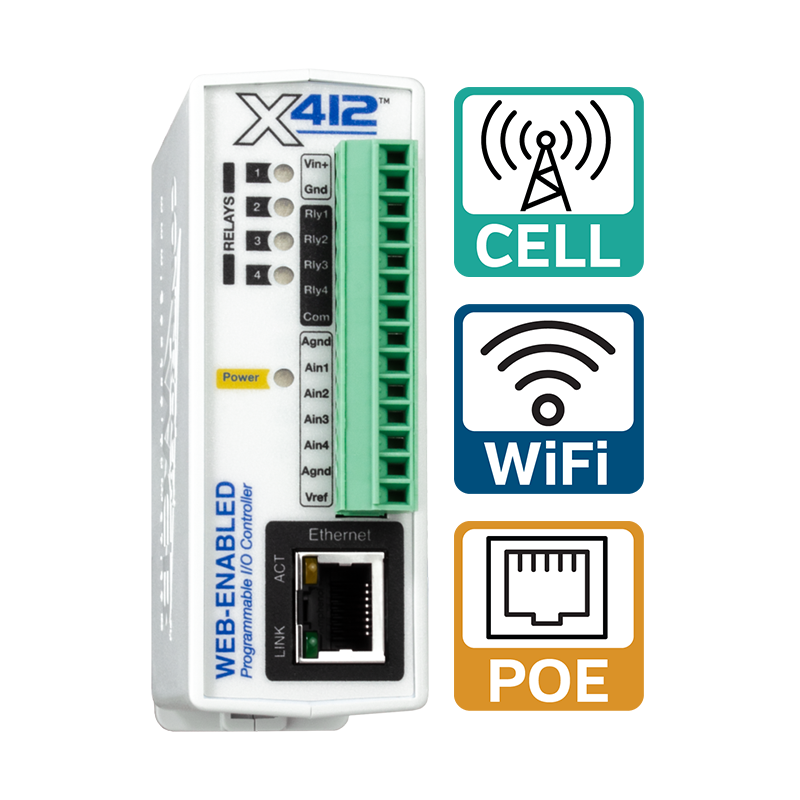 The X-412 has the same features as our most popular relay controllers combined with analog data capture. It’s a flexible relay module that’s ideal for applications such as measuring liquid levels, flow rates, and other parameters that require real-time visibility.
